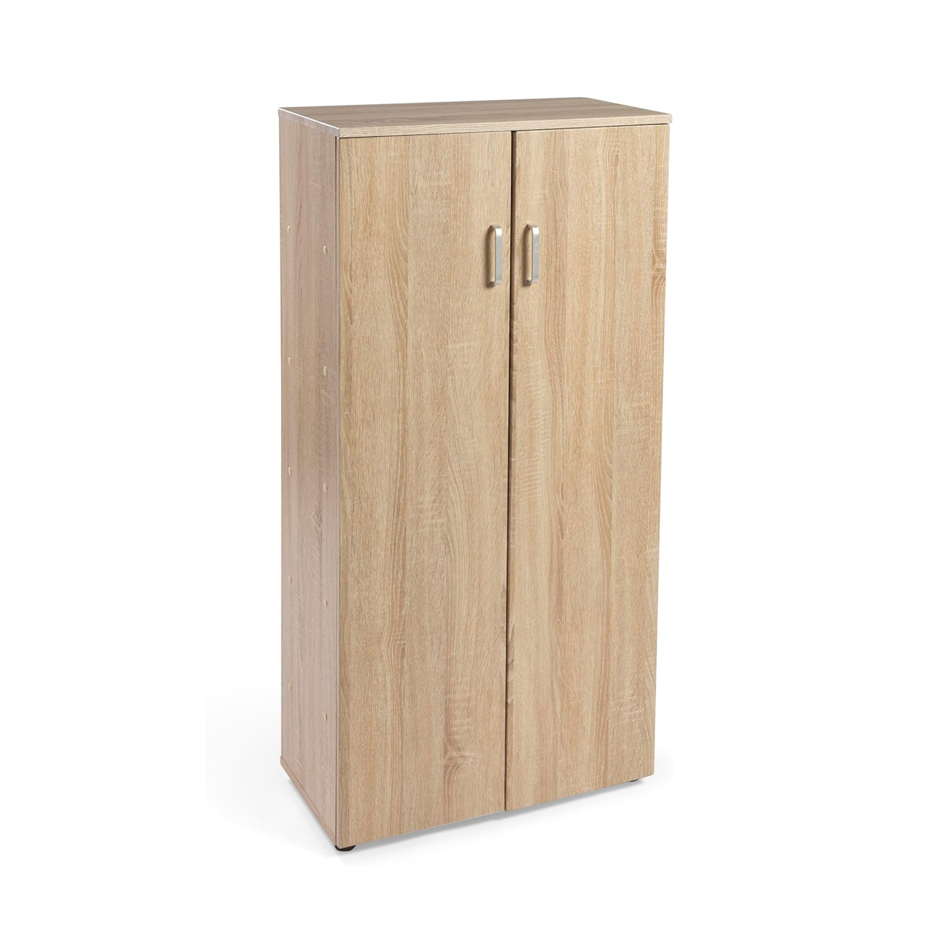 En su interior cuenta con cinco baldas que permiten organizar cómodamente hasta 24 pares de zapatos, libros u otros objetos, adaptándose a distintas necesidades según el uso que le des. Las puertas tipo libro aportan un acceso cómodo y protegen el contenido del polvo, mientras que la superficie de melamina facilita la limpieza diaria y garantiza una larga durabilidad.