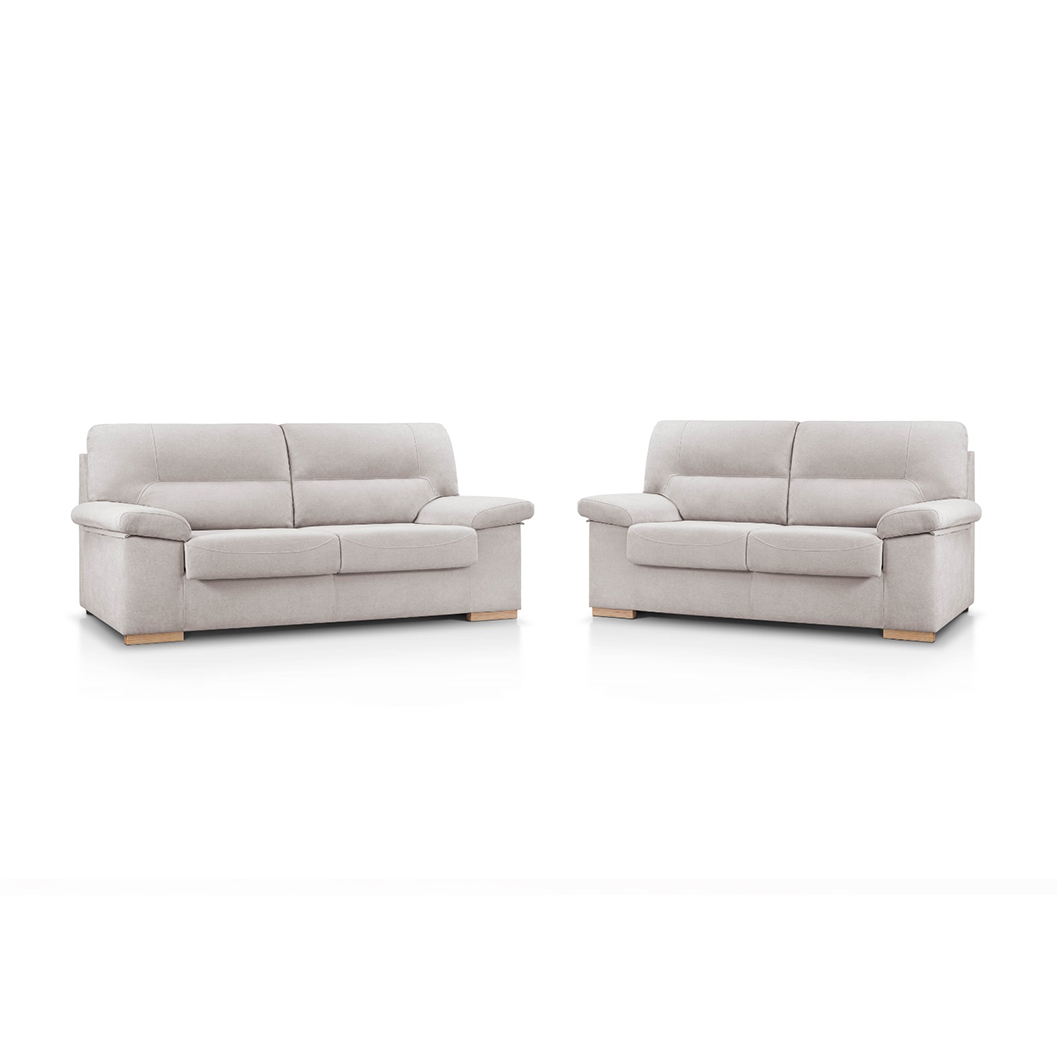 El conjunto incluye un sofá de 3 plazas de 180 cm de ancho y un sofá de 2 plazas de 140 cm de ancho, ofreciendo una distribución versátil y adaptable a diferentes espacios.