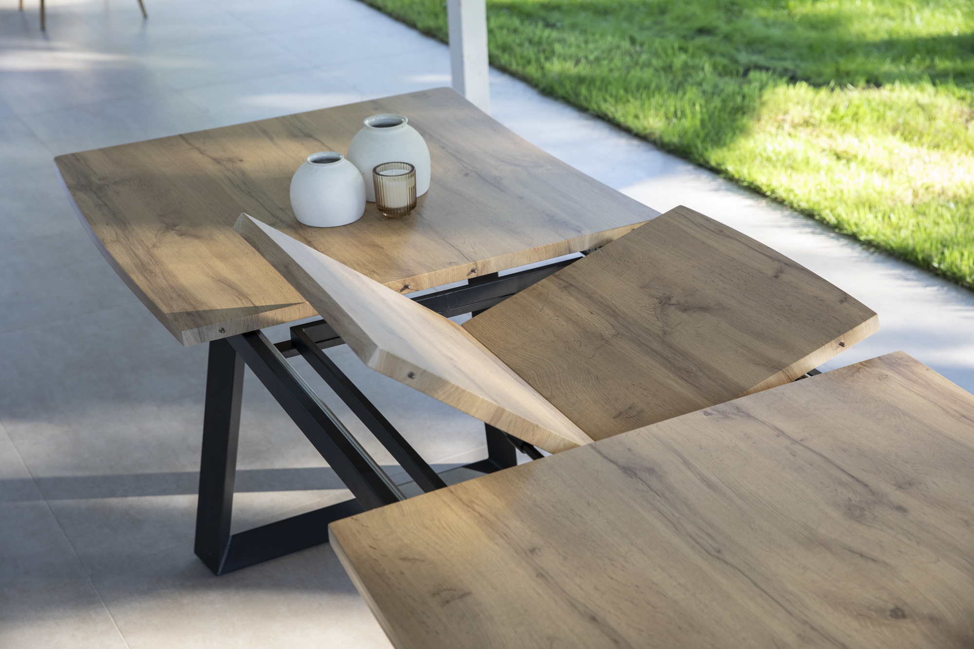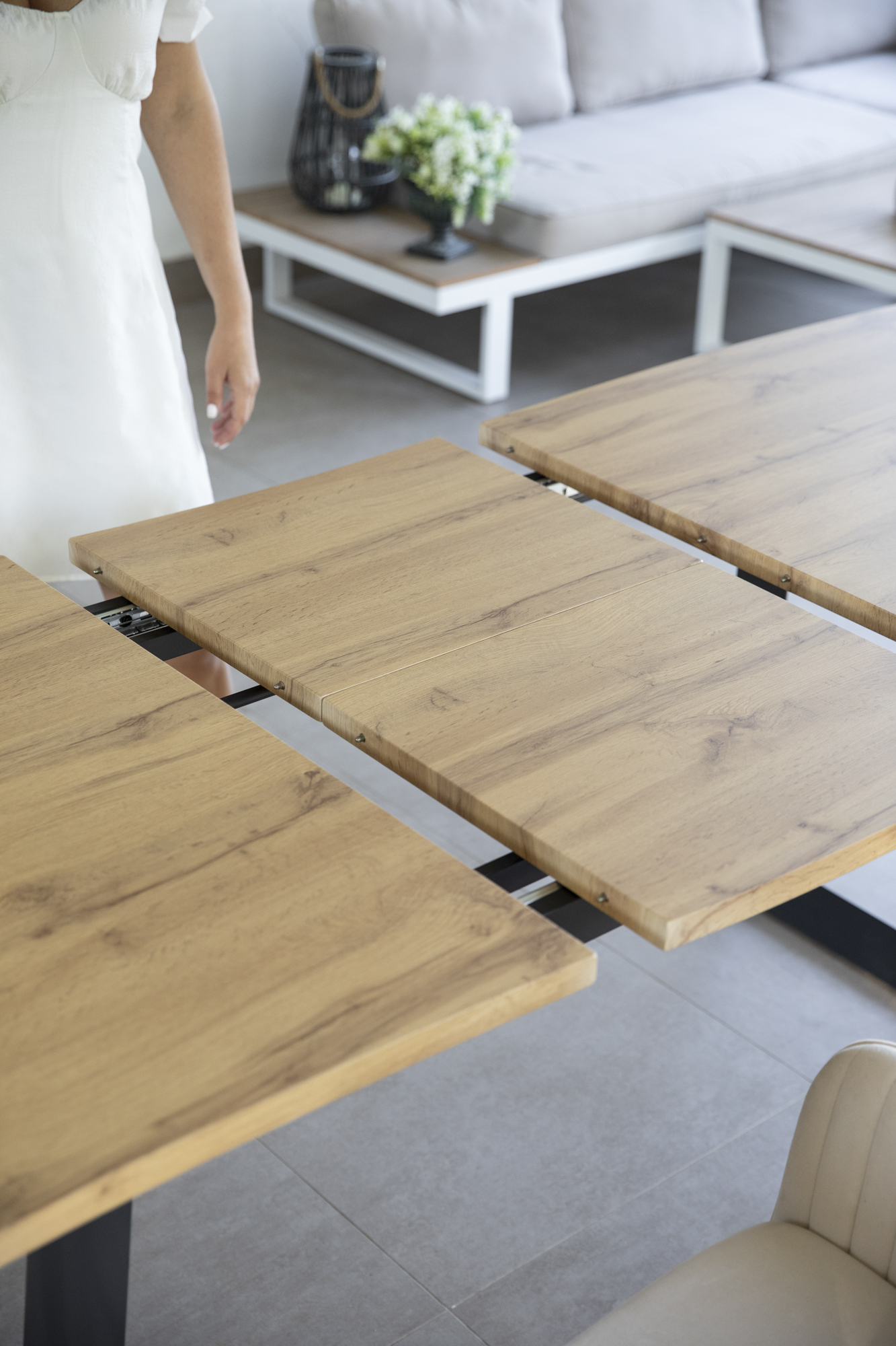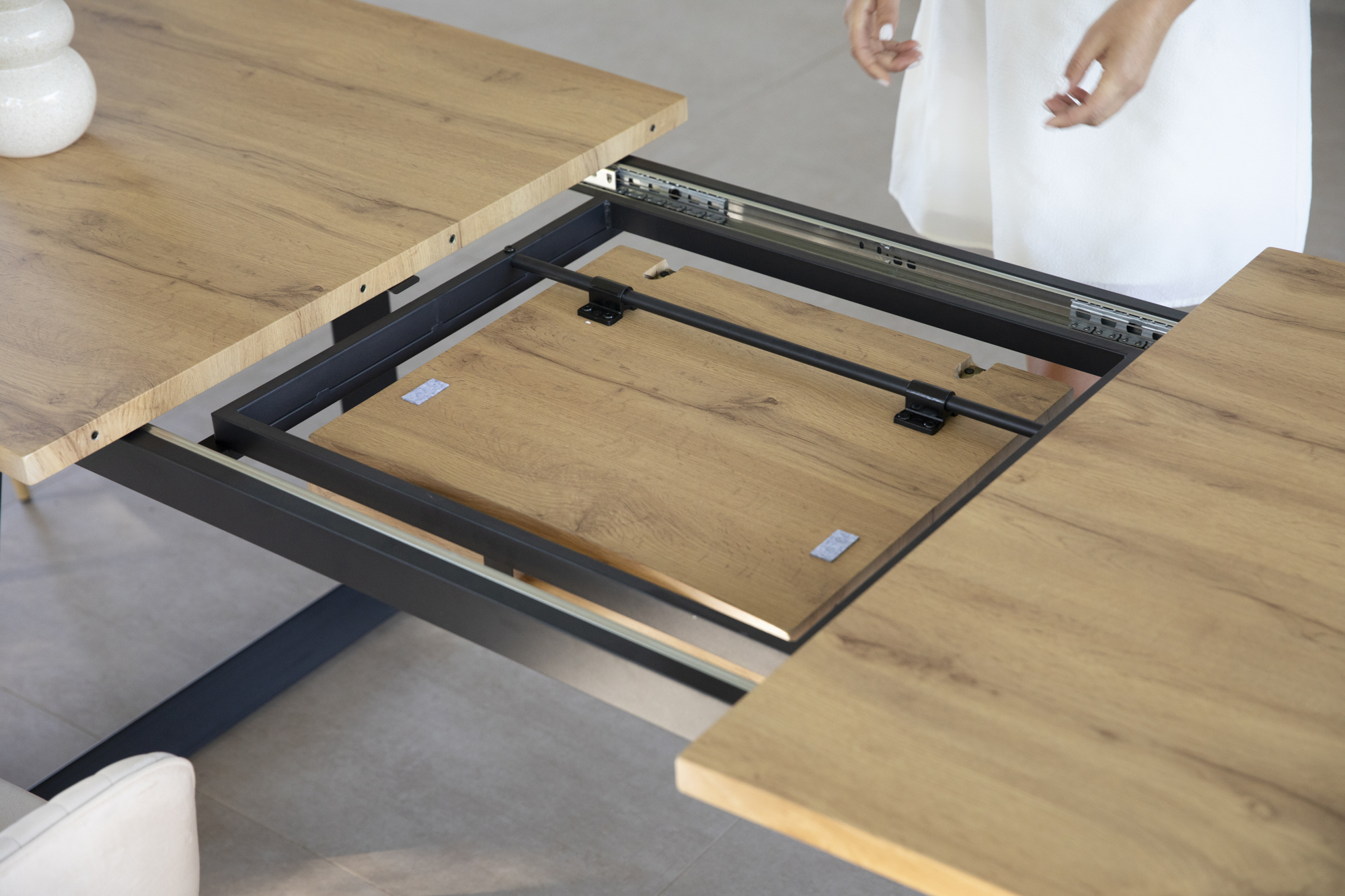 Su sistema extensible integrado permite ampliar fácilmente la superficie de 180 cm a 230 cm de largo, conservando un ancho de 90 cm y una altura de 77 cm. Gracias a esta funcionalidad, se adapta sin esfuerzo a diferentes momentos del día: desde comidas cotidianas con la familia hasta reuniones más amplias con amigos o celebraciones especiales, permitiendo acomodar cómodamente entre 6 y 10 comensales.