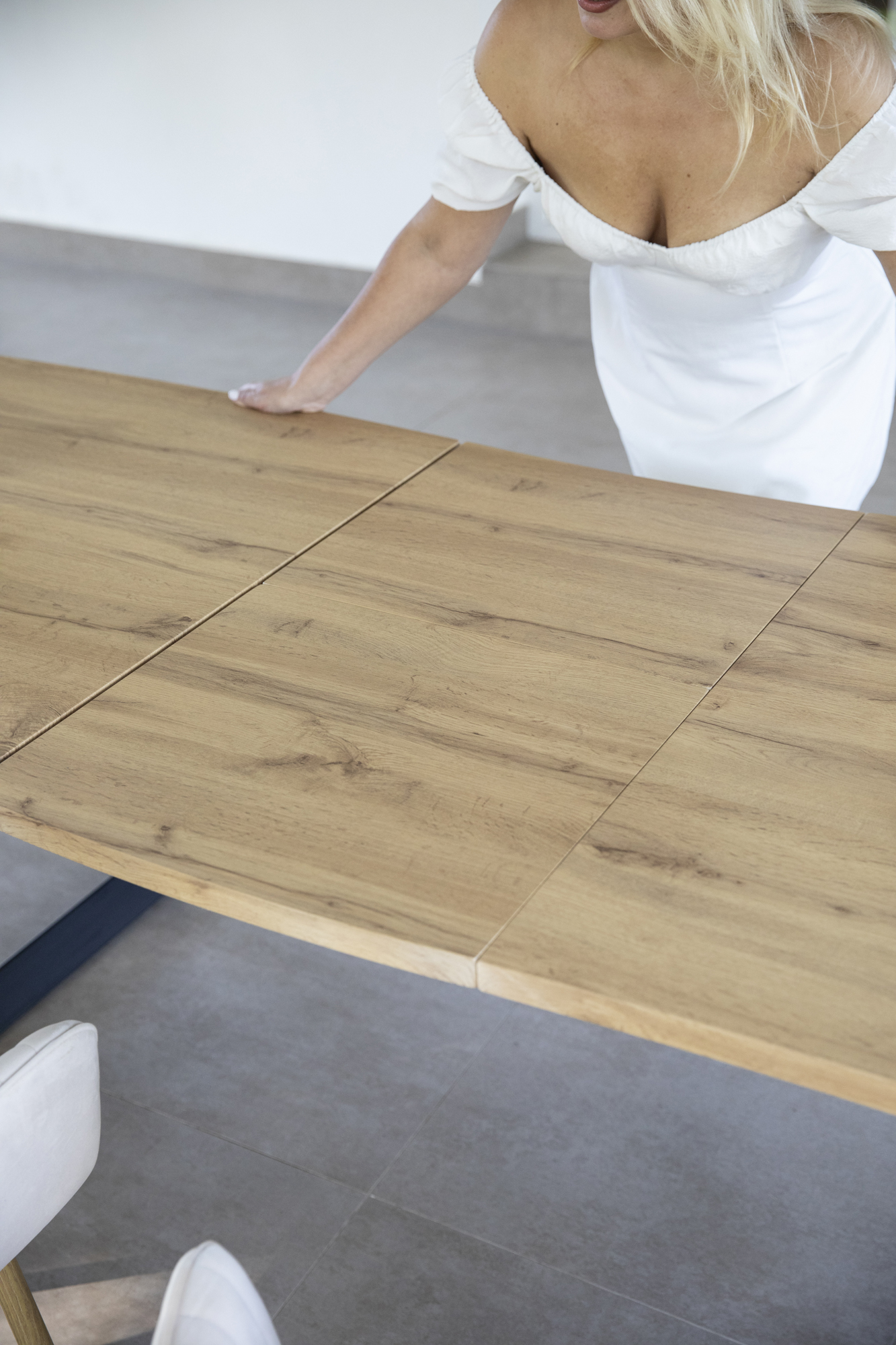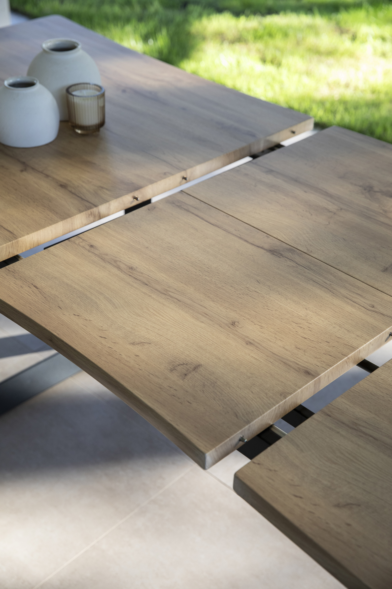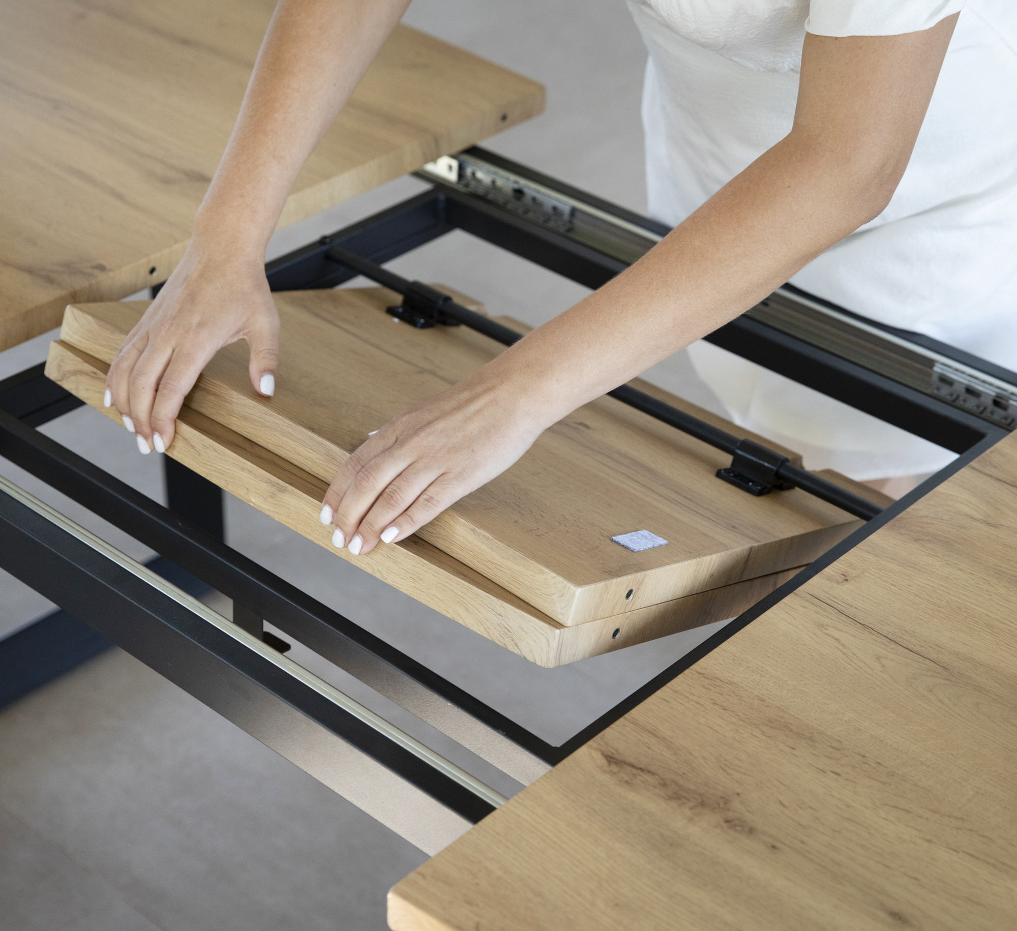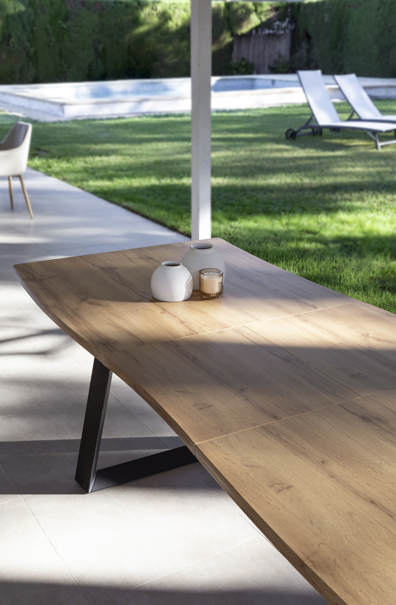 Su sistema extensible integrado permite ampliar fácilmente la superficie de 180 cm a 230 cm de largo, conservando un ancho de 90 cm y una altura de 77 cm. Gracias a esta funcionalidad, se adapta sin esfuerzo a diferentes momentos del día: desde comidas cotidianas con la familia hasta reuniones más amplias con amigos o celebraciones especiales, permitiendo acomodar cómodamente entre 6 y 10 comensales.