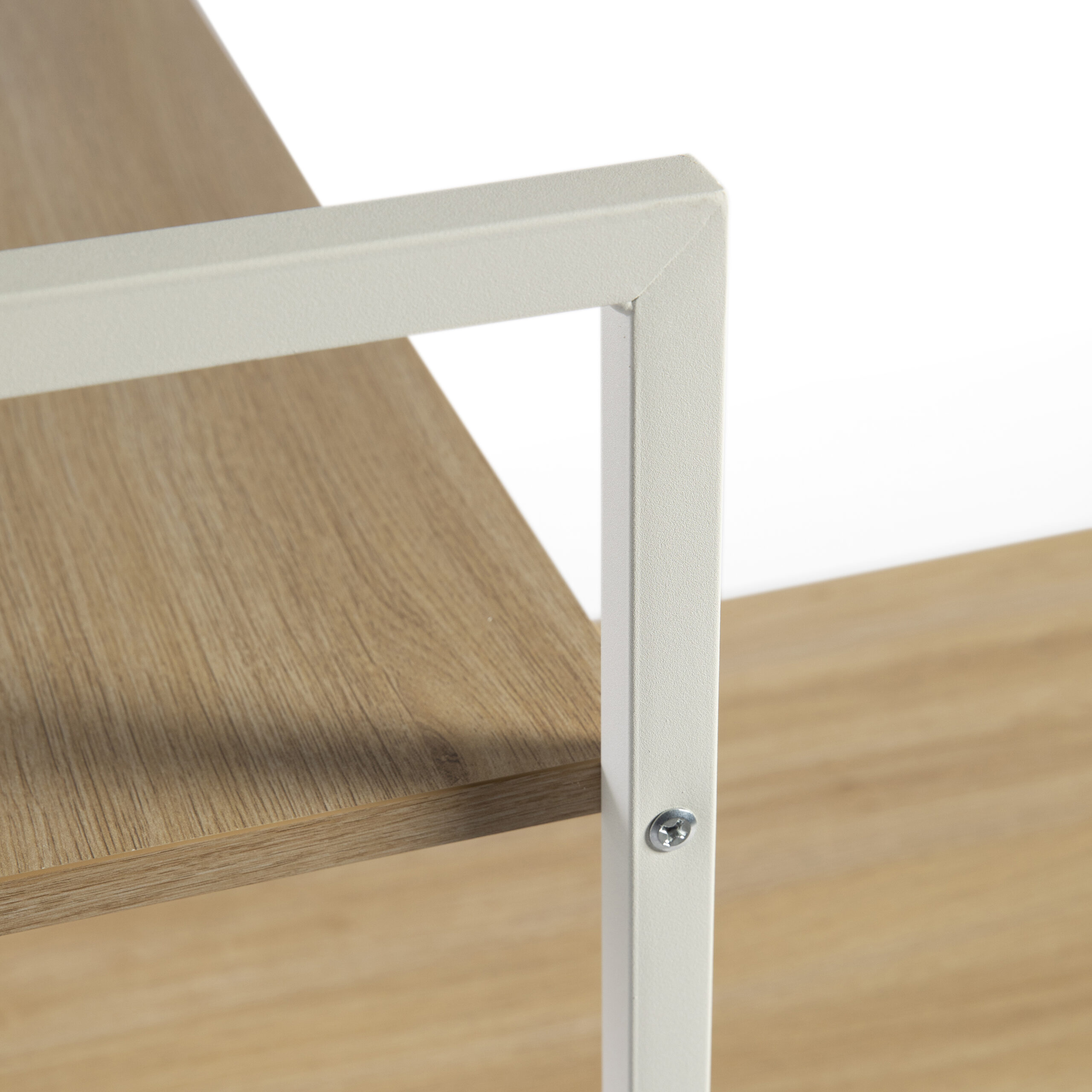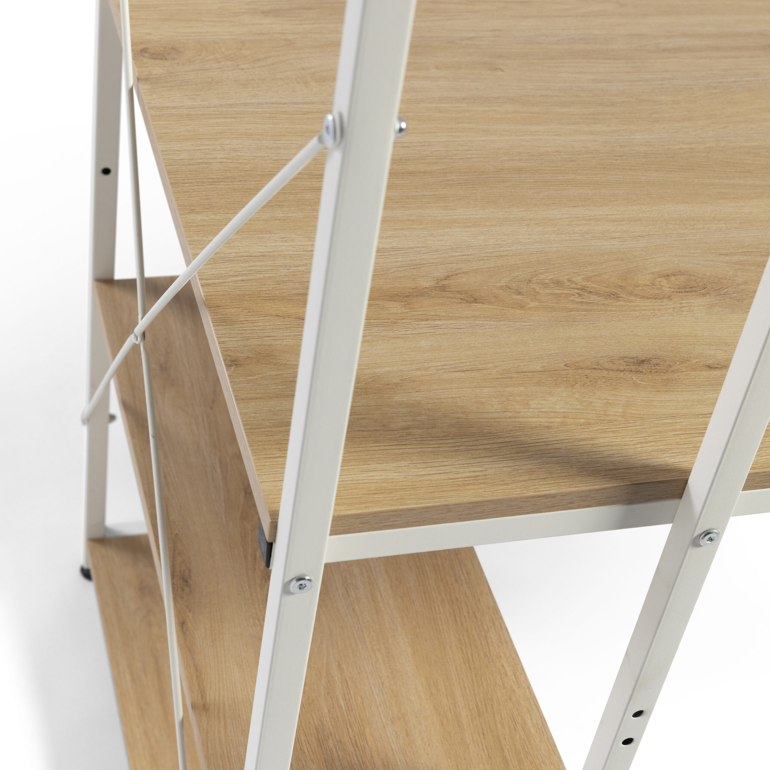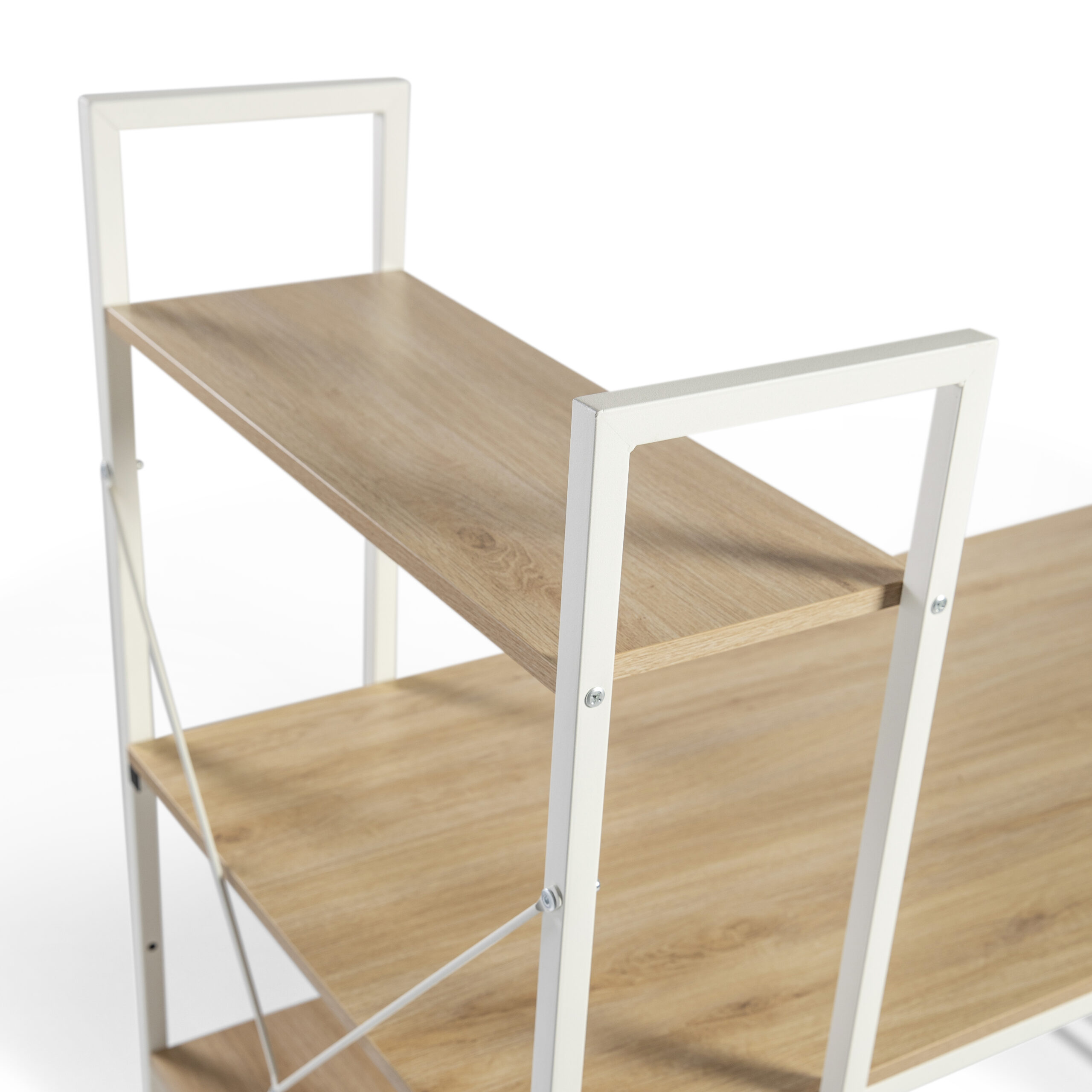 La estantería se puede montar a cualquier lado del escritorio según tus necesidades y la distribución del hogar, lo que la hace muy versátil. El primer estante de abajo de la encimera es ajustable o removible para objetos de diferente altura. La estructura de metal reforzada con tirantes en forma X asegura estabilidad y solidez, soportando hasta 50 kg en el tablero y 20 kg en cada estante.