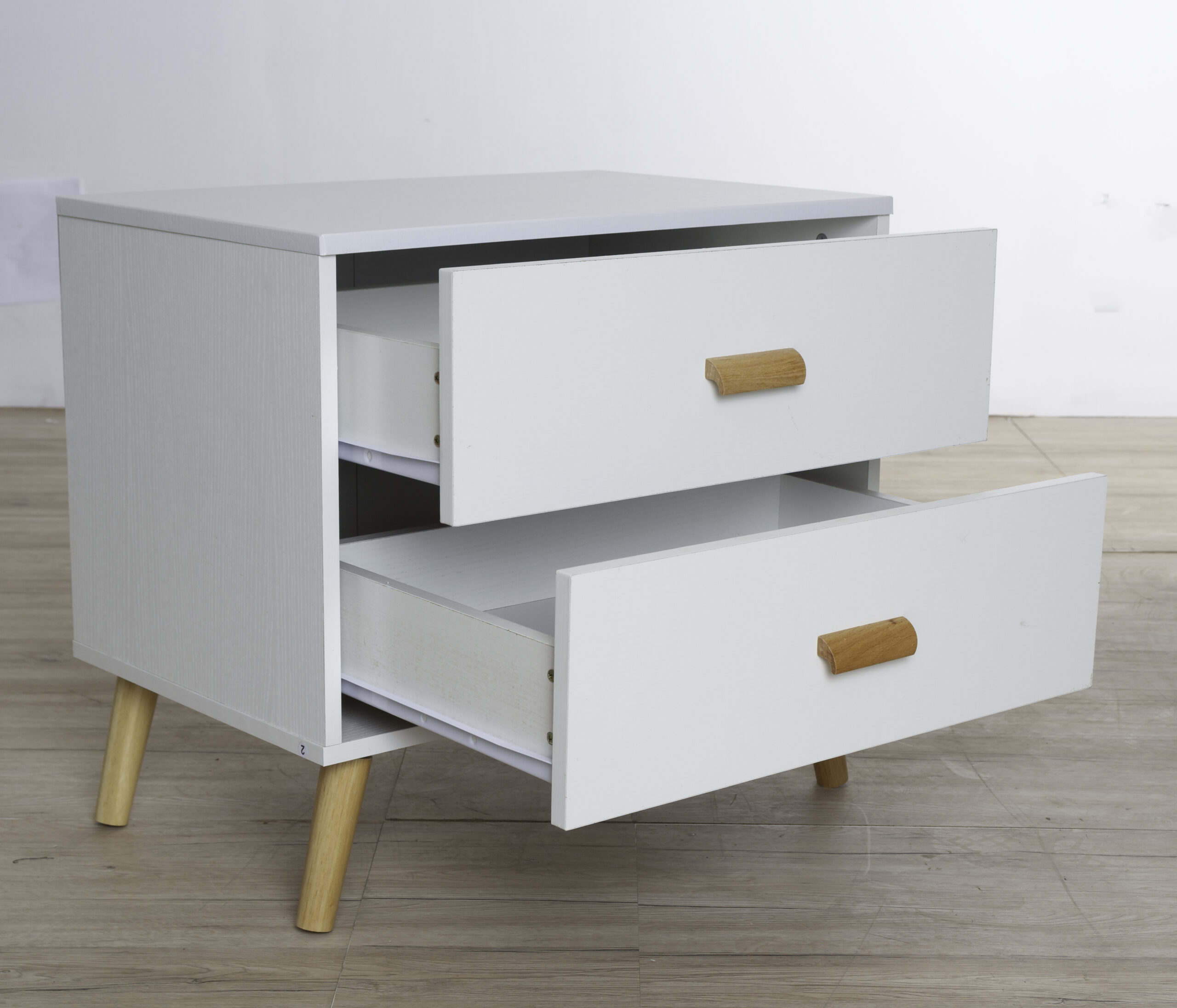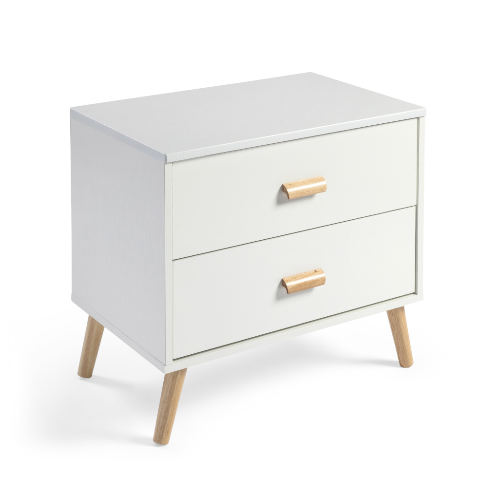 Está fabricada en madera resistente con un elegante acabado en color cambria, ideal para combinar con todo tipo de ambientes, desde dormitorios modernos hasta salones o recibidores más clásicos. Sus patas cónicas de madera maciza aportan estabilidad y un aire nórdico que encaja con las tendencias actuales en decoración. Además, cuenta con dos cajones amplios equipados con guías metálicas que aseguran una apertura suave y duradera, lo que permite guardar objetos de forma práctica y mantener el orden sin renunciar al diseño.