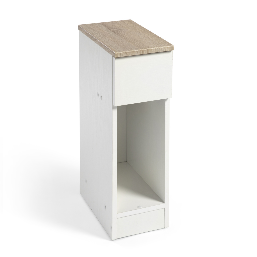 SLIM cuenta con dos compartimentos inteligentes: un cajón superior con cierre suave para guardar ropa interior, objetos personales o cualquier artículo que prefieras mantener fuera de la vista; y un compartimento abierto en la parte inferior, con una profundidad de 35 cm, perfecto para almacenar libros, dispositivos o accesorios que necesites tener siempre a mano.