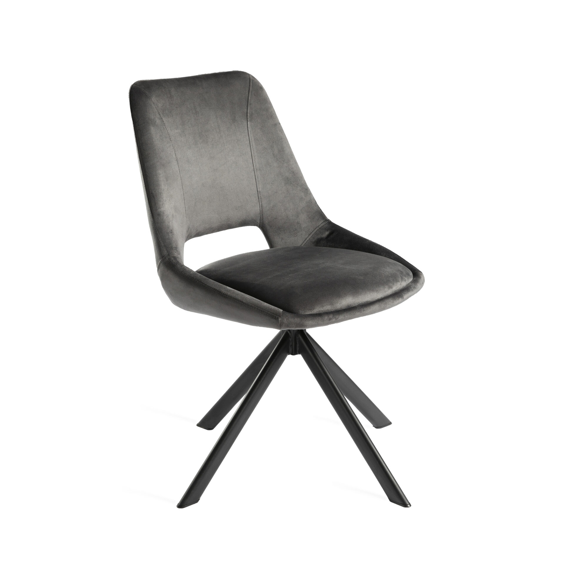 Diseño, confort y funcionalidad se unen en esta silla giratoria 360°, ideal para espacios modernos y elegantes. Tapizada en suave antelina gris, aporta un toque sofisticado y atemporal al ambiente, mientras su asiento acolchado garantiza una experiencia cómoda en cualquier ocasión. La estructura se completa con unas resistentes patas metálicas negras en forma de aspa, que refuerzan su estilo contemporáneo y aseguran gran estabilidad.