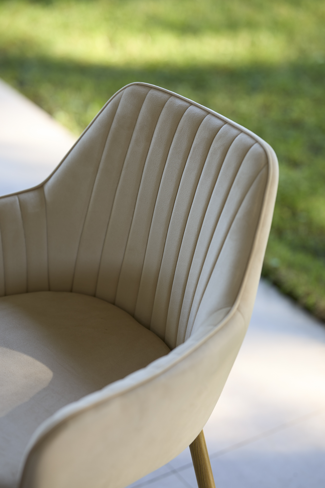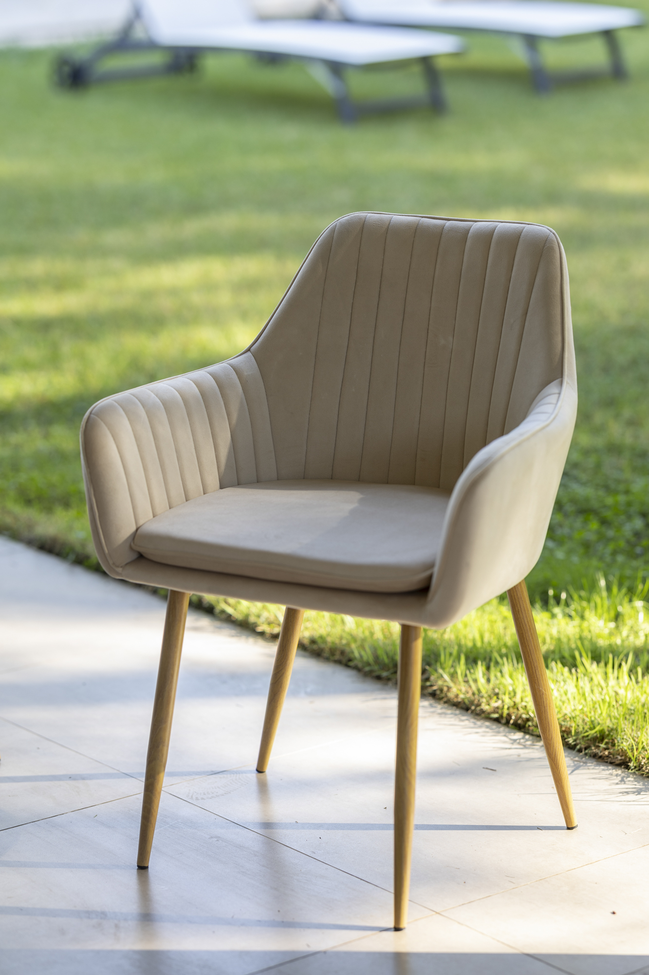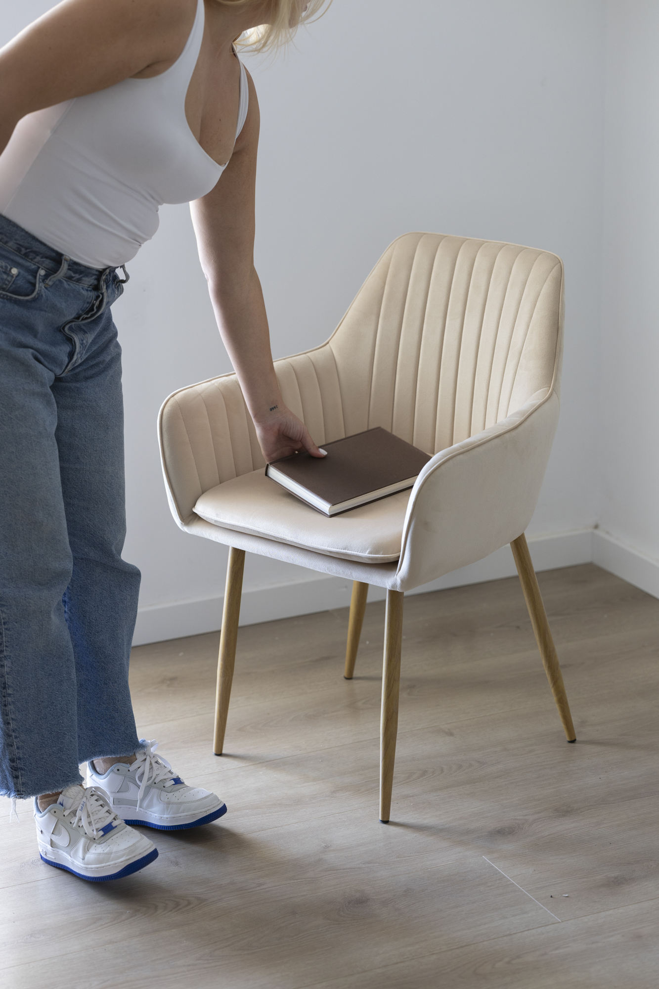 Dale a tu hogar un toque cálido y moderno con este sillón modelo JÁVEA en color beige, que combina a la perfección diseño escandinavo, calidad premium y funcionalidad. Tapizado en suave terciopelo beige, su textura aporta calidez y elegancia a cualquier espacio, mientras que sus patas metálicas con acabado efecto madera le dan un aire natural sin renunciar a la resistencia.