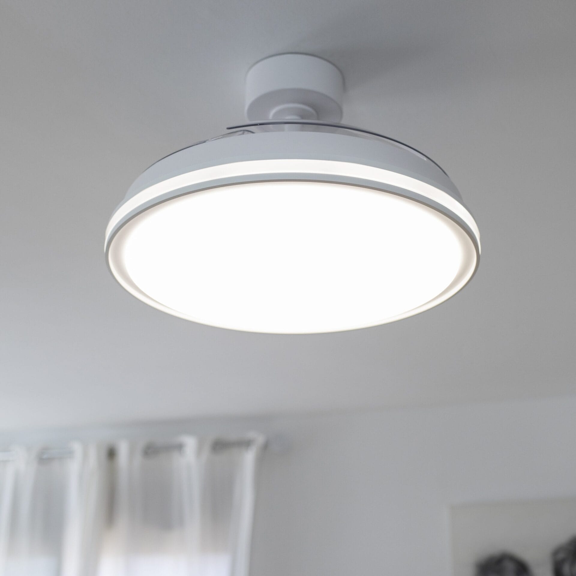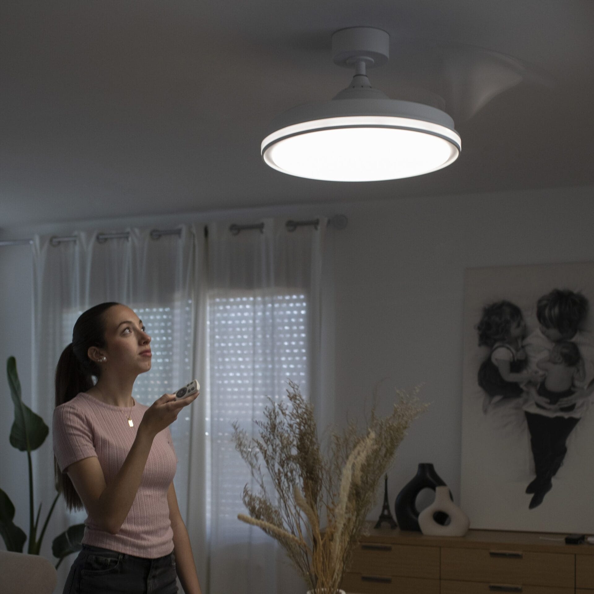 Su diseño compacto esconde tres aspas retráctiles que se despliegan solo cuando están en uso, manteniendo el plafón discreto y elegante el resto del tiempo. Puedes elegir entre seis velocidades distintas y programarlo fácilmente desde el mando a distancia incluido, adaptándolo al momento del día o a la estación del año.