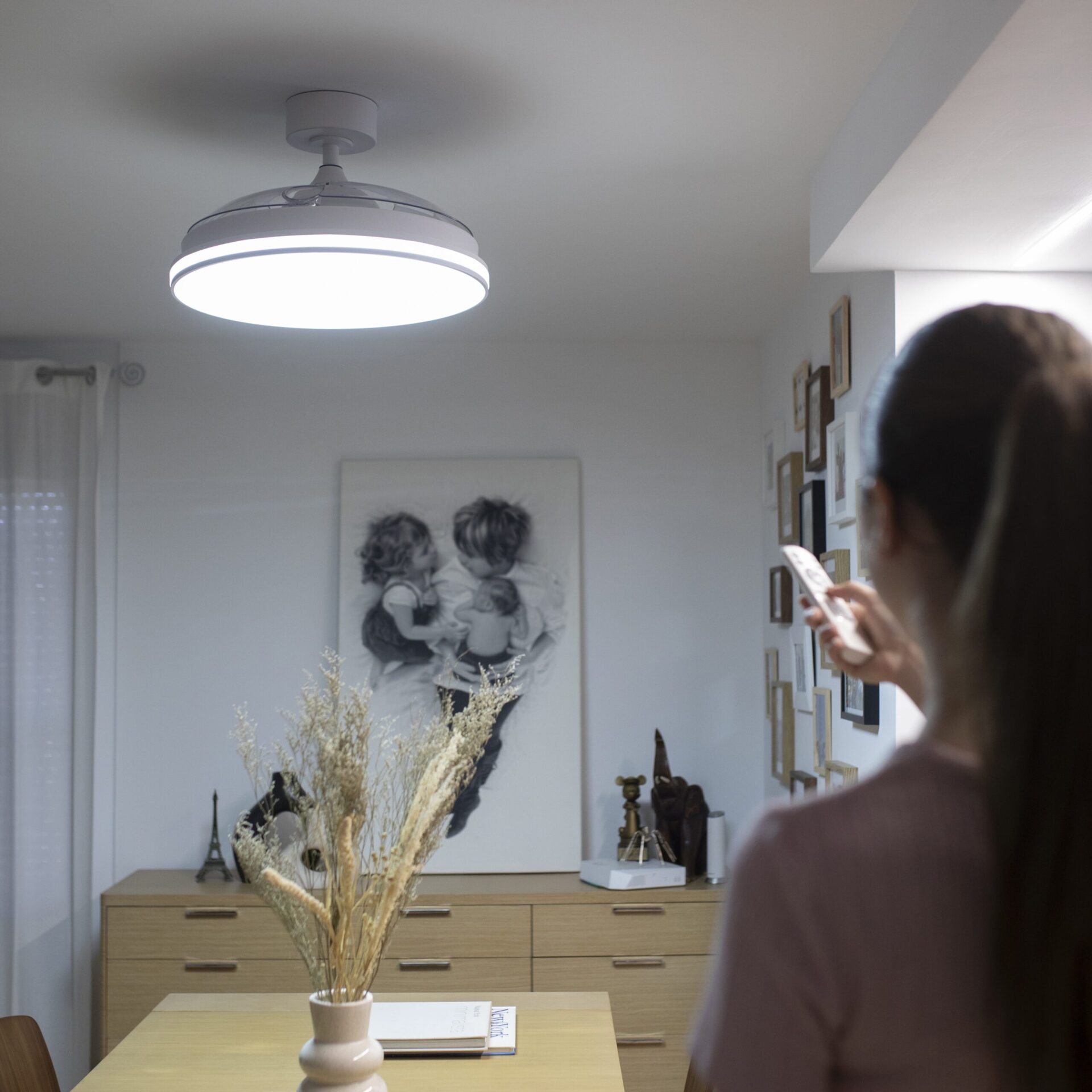 Pensado para habitaciones de hasta 18 m², incorpora una luz LED 45W de 2400 lúmenes con tres temperaturas de color (3000-4000-6500K)—cálida, neutra y fría— que podrás cambiar fácilmente desde el interruptor o el mando. Así, tendrás una iluminación adaptada a cada momento: relajarte, leer o concentrarte.