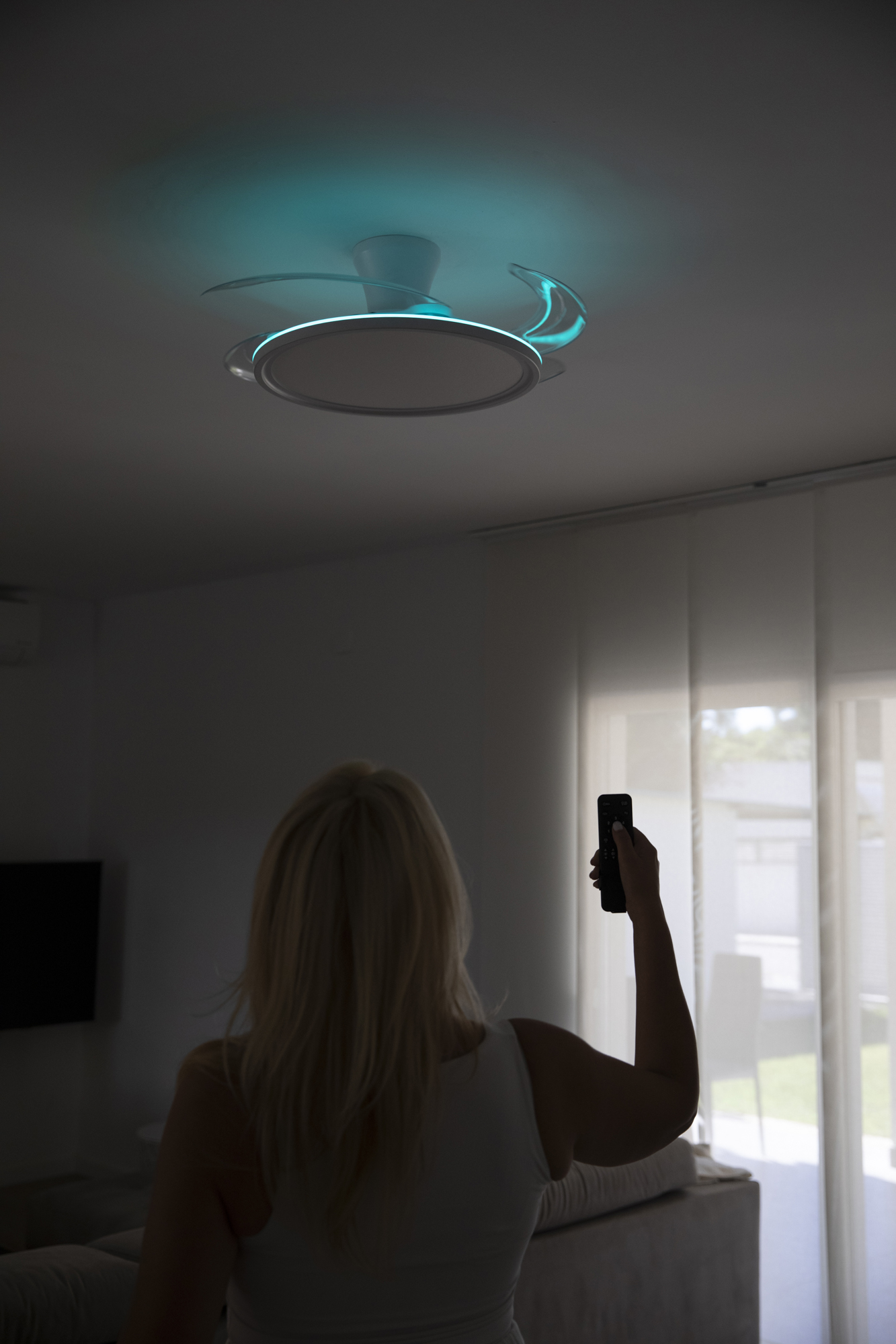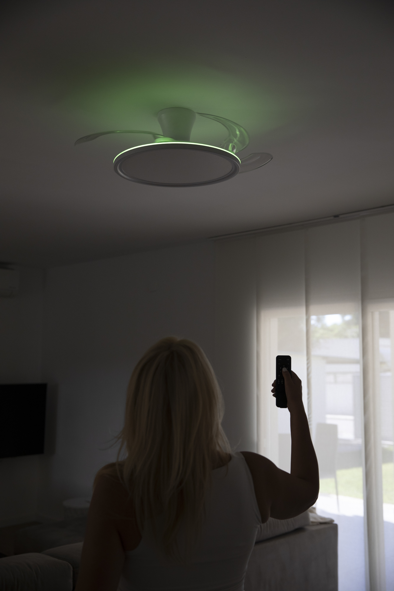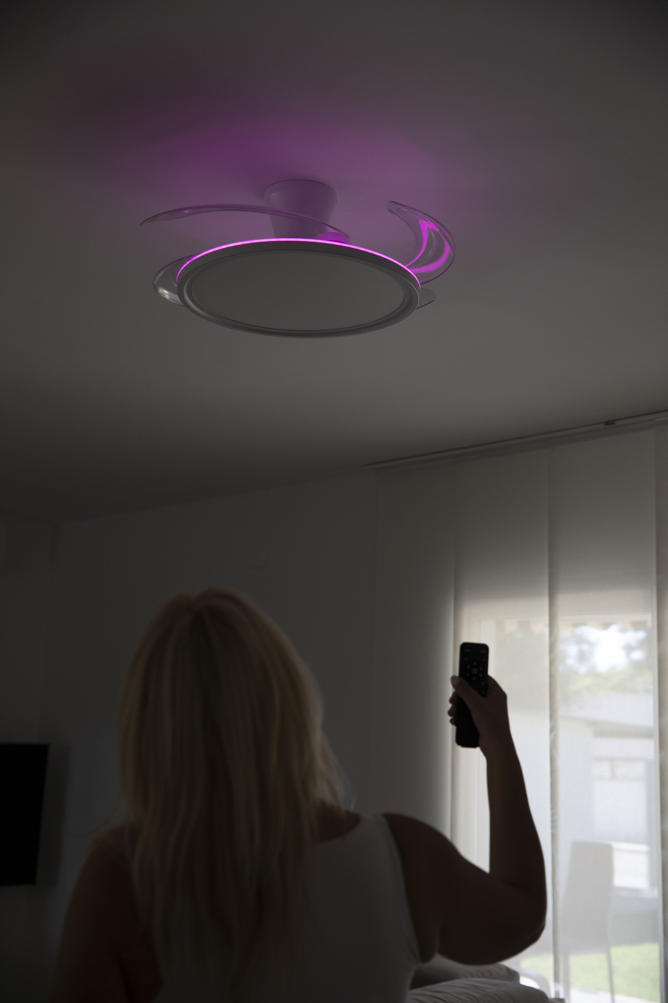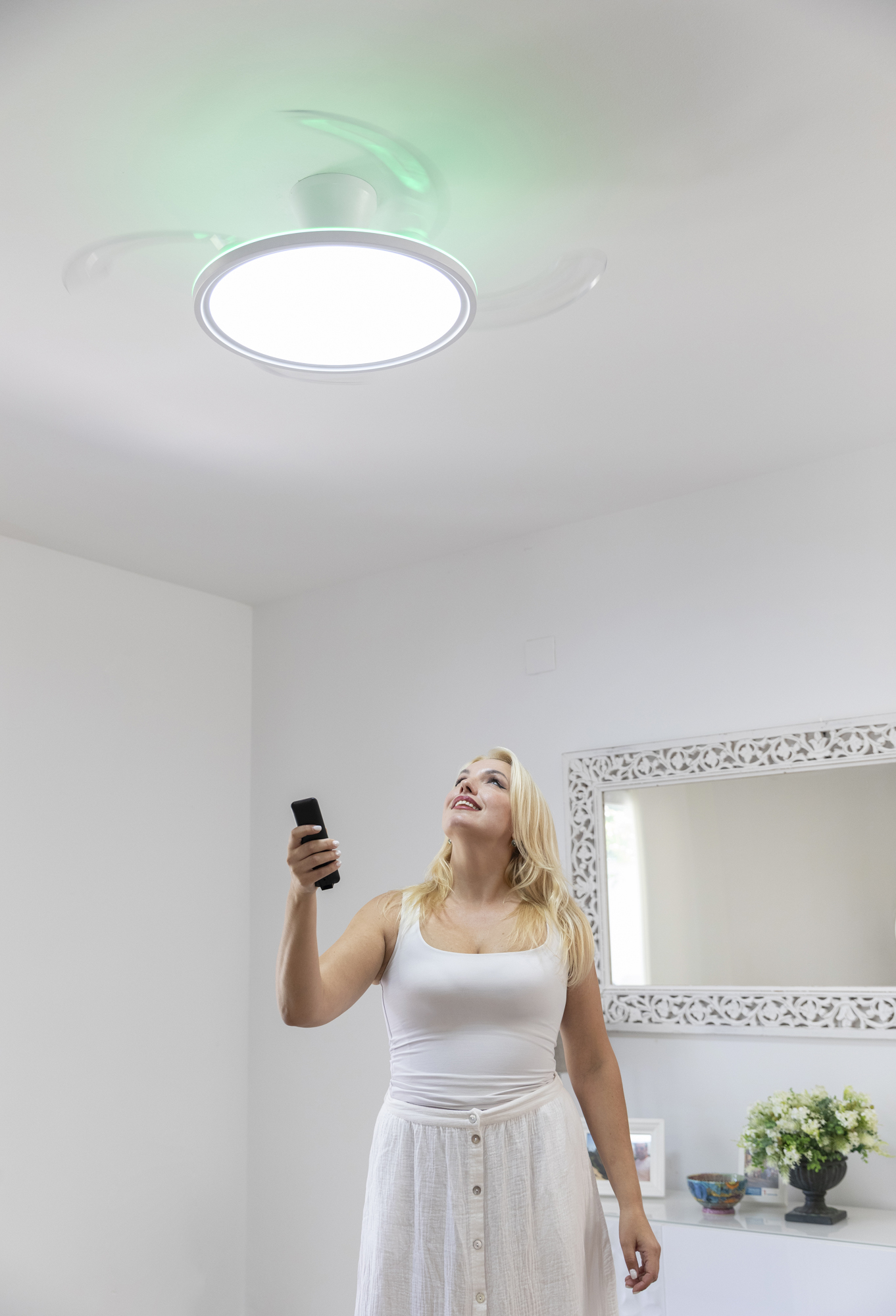 Pensado para habitaciones de hasta 27 m², incorpora una luz LED de 2400 lúmenes con tres temperaturas de color —cálida, neutra y fría— que podrás cambiar fácilmente desde el interruptor o el mando. Así, tendrás una iluminación adaptada a cada momento: relajarte, leer o concentrarte.