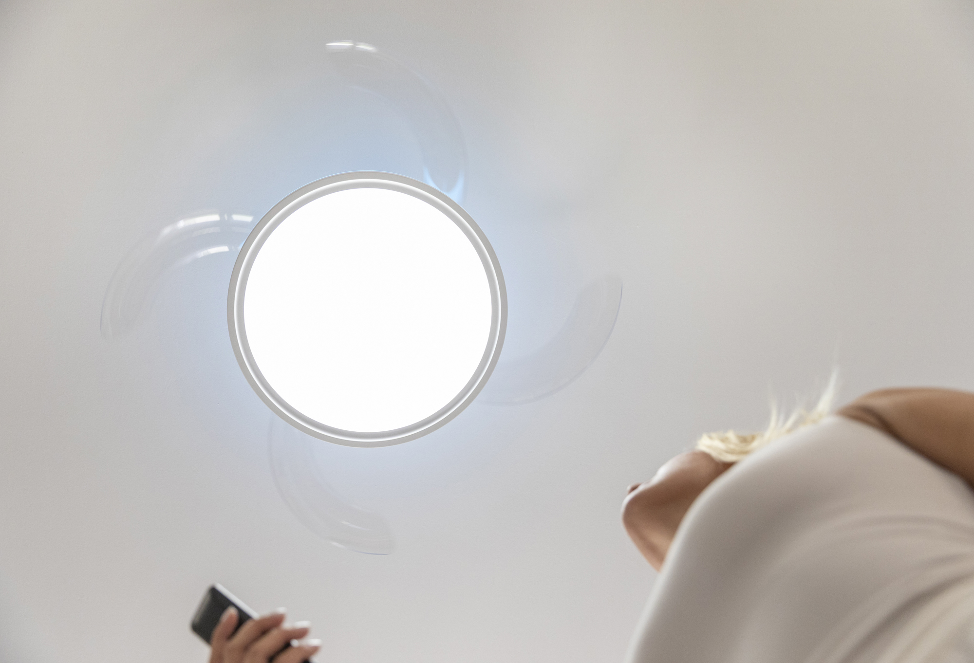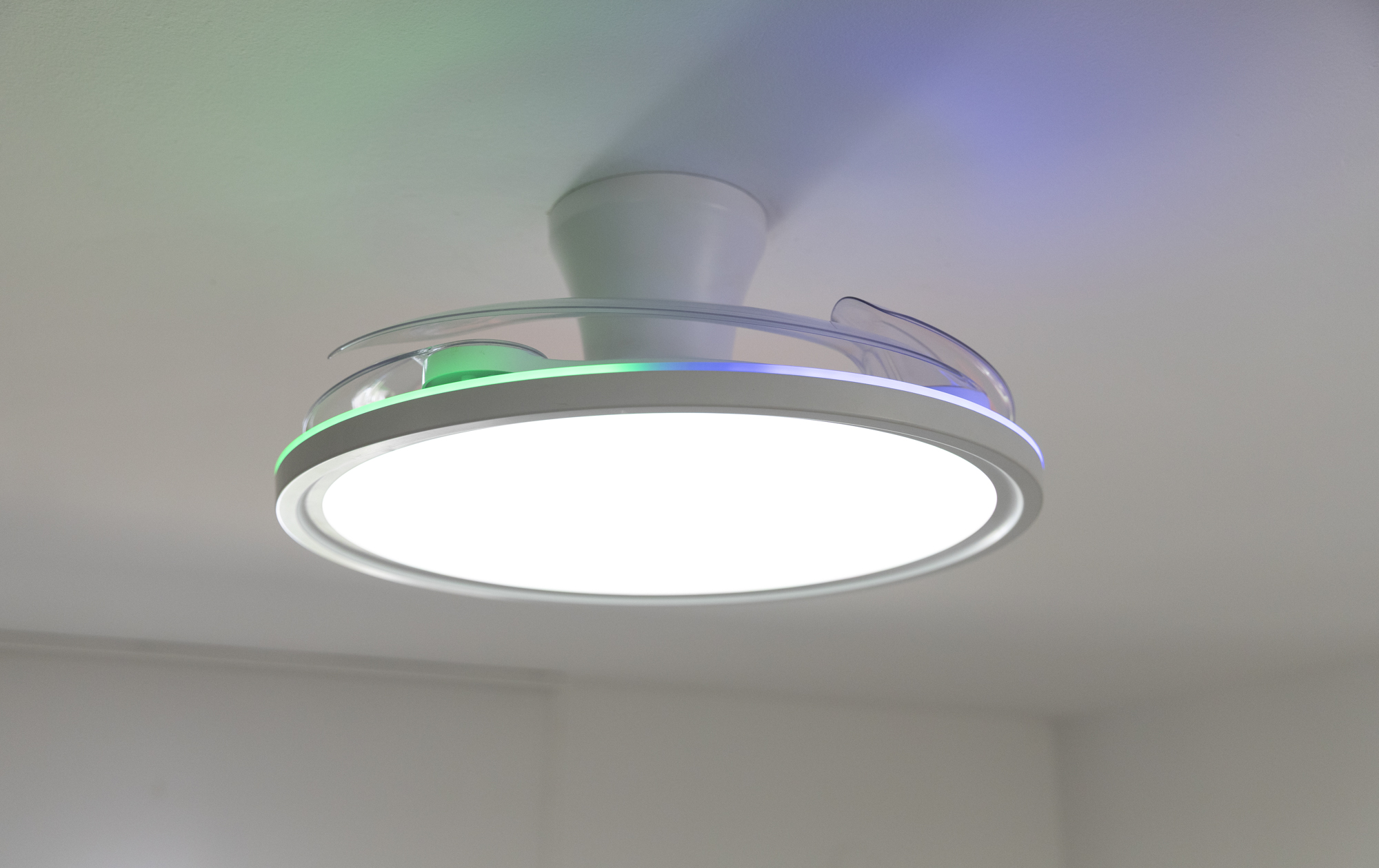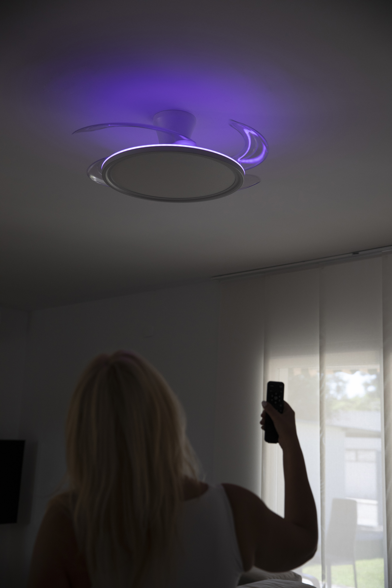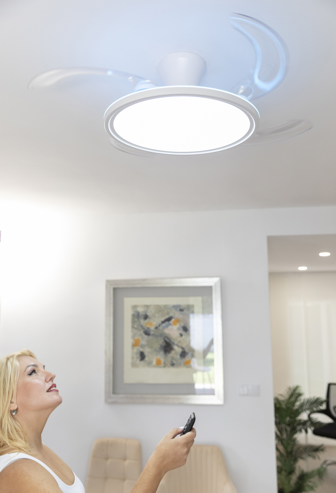 Pensado para habitaciones de hasta 27 m², incorpora una luz LED de 2400 lúmenes con tres temperaturas de color —cálida, neutra y fría— que podrás cambiar fácilmente desde el interruptor o el mando. Así, tendrás una iluminación adaptada a cada momento: relajarte, leer o concentrarte.