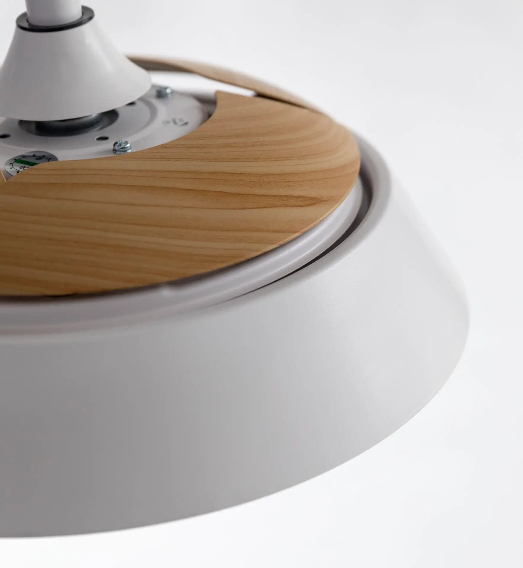 Porque estilo tiene de sobra, con unas aspas en madera color roble que aportan naturalidad y un plafón blanco que combina con todo.